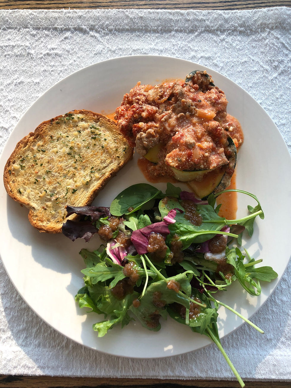 To assemble, layer some ricotta cheese, pasta sauce and meat mixture flat on to a zucchini slice. Roll the zucchini slice and place facing up in the dish. Repeat for all slice and until baking dish is full.