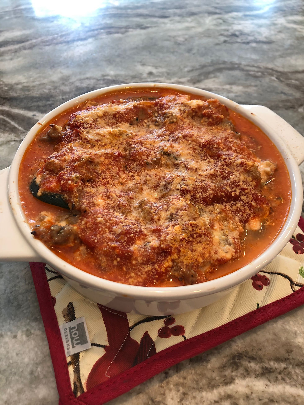 This is very messy, I recommend topping the zucchini in the baking dish with all the innards that fell out while rolling. Finish topping with a little more pasta sauce and parmesan cheese.